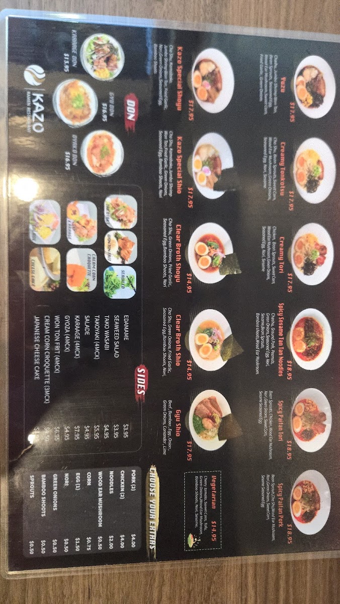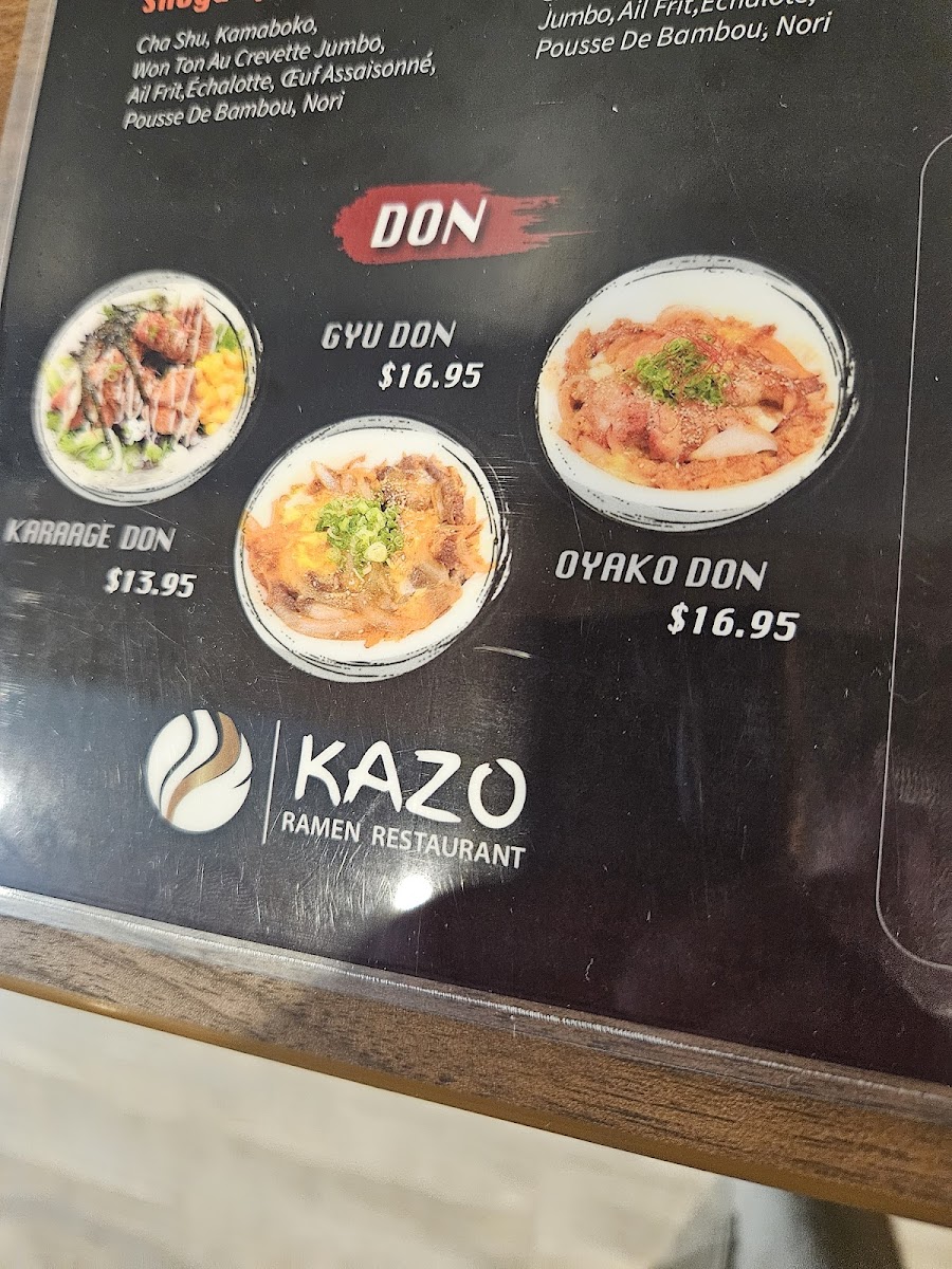 The menu at Kazo Ramen Mont-Royal features a variety of Japanese dishes with a focus on ramen and traditional sides. Visitors can expect several ramen options distinguished by different broths and flavor profiles, including creamy and spicy preparations. The menu also includes appetizers such as Karaage (Japanese fried chicken) and other small plates commonly found in Japanese cuisine.